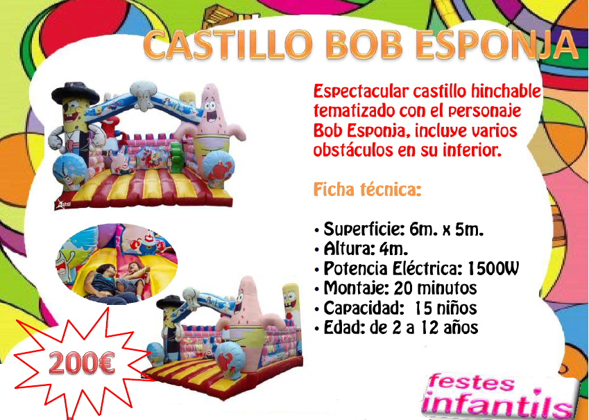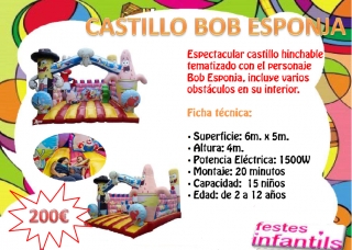 Espectacular inflable tematitzat de Bob Esponja i altres personatges, inclou obstacles al seu interior